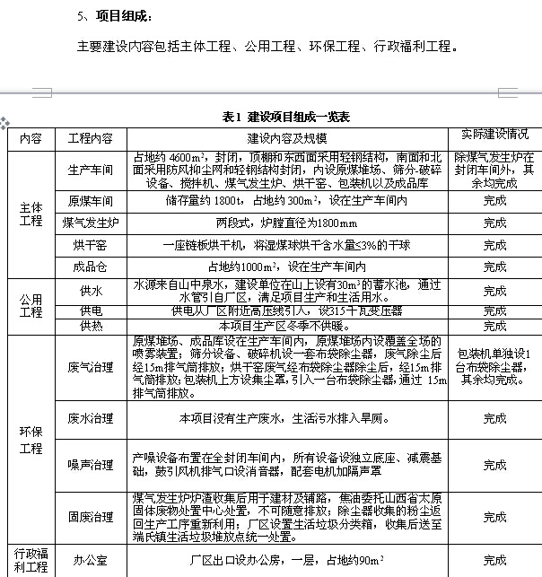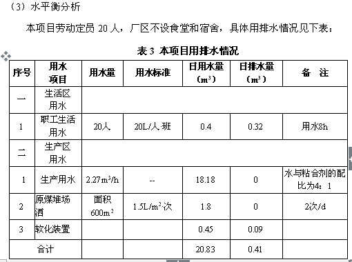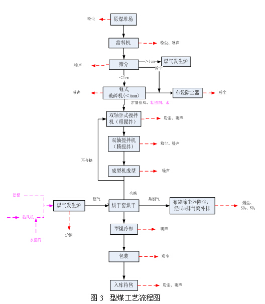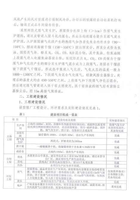 产品方案:本项目生产的型煤规格为直径为60mm,厚度为36mm,发热量为5800千卡/千克,约为24.36 MJ/kg。