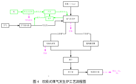 下段煤气的产生:原煤在干馏段被下段煤气干馏后,形成热半焦进入气化段。热半焦的挥发份一般为3~5%。热半焦因脱去煤中的活性组份,气化活性有所降低,其气化强度一般可达270~350kg/㎡·h,二段式气化炉气化火层的温度一般为1000~1300℃之间。下段煤气为完全气化煤气,几乎不含焦油,但灰分较高,经旋风除尘器除尘,处理后的温度大约在450-550℃之间。