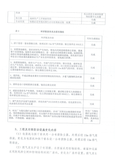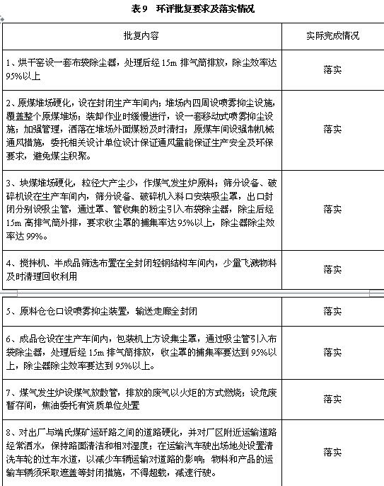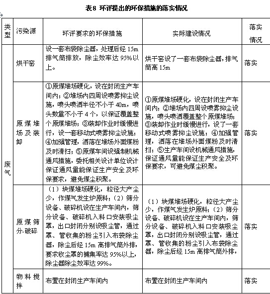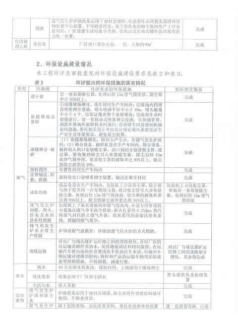 2016年9月委托晋城市绿和环保技术咨询有限公司编制了《沁水县诚友型煤有限公司年产10万吨型煤项目环境影响报告表》,报告表中要求的主要环保措施及落实情况如下: