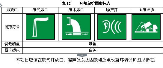 根据《环境保护图形标志排放口(源)》(GB15562.1-1995)及《环境保护图形标志固体废物贮存(处置)场》(GB15562.2-1995)中有关规定,在厂区内“三废”及噪声排放点设置标志牌,标志见下表: