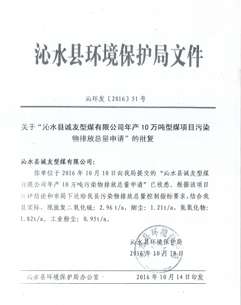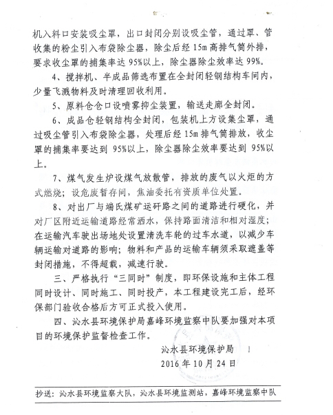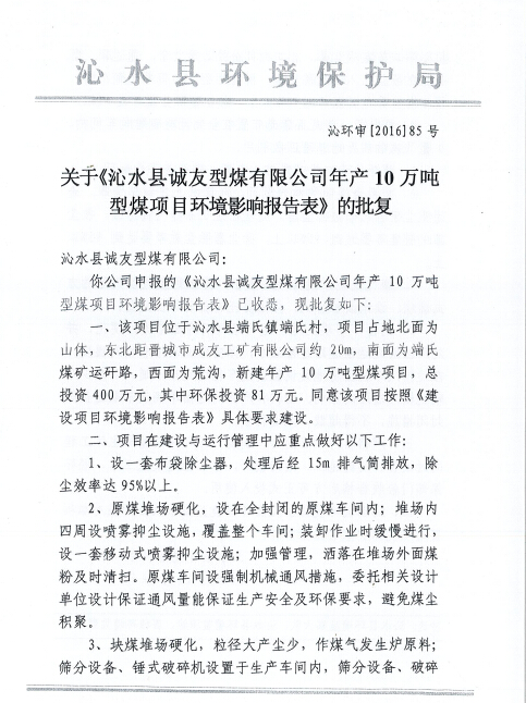 2016年10月24日,沁水县环境保护局以沁环审[2016]85号文对该项目环境影响报告表进行了批复。