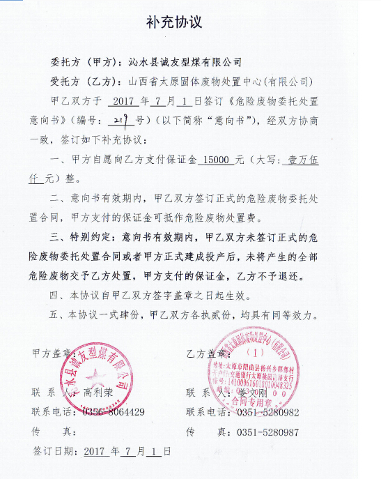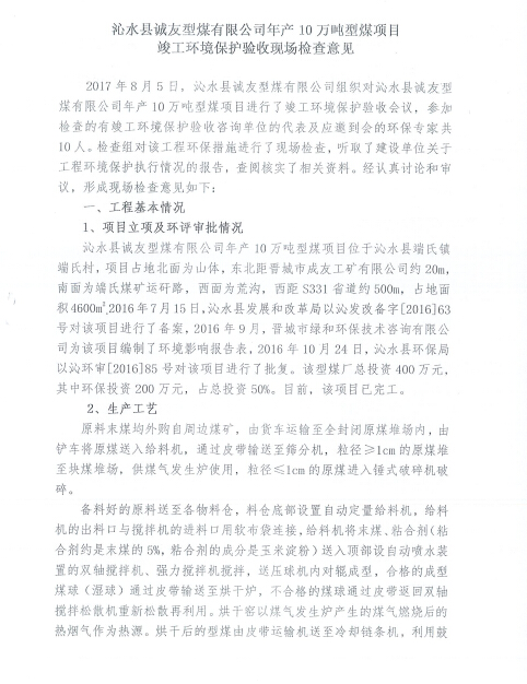 2017年8月5日,沁水县诚友型煤有限公司组织对沁水县诚友型煤有限公司年产10万吨型煤项目进行了竣工环境保护验收会议,参加检查的有竣工环境保护验收咨询单位的代表及应邀到会的环保专家共10人,检查组对该工程环保措施进行了现场检查,听取了建设单位关于工程环境保护执行情况的报告,经认真讨论和审议后,提出以下要求及建议: