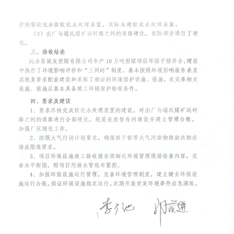 综上所述,沁水县诚友型煤有限公司在建设过程中已基本落实了环评及其批复要求,符合验收条件和要求,可以予以验收。